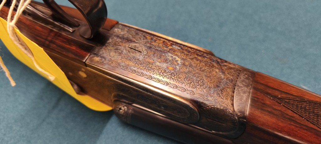 dated 1996, 27in. nitro chopperlump barrels, 2 3/4in. chambers, bored approx. imp. cyl. and Improved modified choke, removable striker discs, automatic safety with gold-inlaid 'S' detail, hand-detachable lockplates, gold-inlaid cocking-indicators, articulated front trigger, rolled-edge triggerguard, border and acanthus scroll engraving, retaining virtually full original colour-hardening and finish, 14 1/4in. stock including 5/8in. rubber recoil pad, weight 5lb. 14oz., in an oak-lined leather case with canvas and leather outer