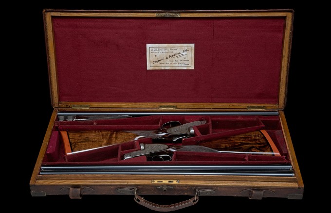 for 1913, 30in. nitro barrels, ribs gold-inlaid '1' and '2' and engraved 'COGSWELL & HARRISON LTD. 141. NEW BOND ST. LONDON.', 2 1/2in. chambers, bored approx. true cyl. and 1/4 choke, toplevers gold-inlaid '1' and '2', automatic safeties with gold-inlaid 'SAFE' detail, cocking-indicators, beaded border and acanthus scroll engraving, brushed finish, 14 1/4in. figured stocks including 3/4in. rubber recoil pads, weight 6lb. 15oz., in their makers brass-cornered oak and leather double guncase