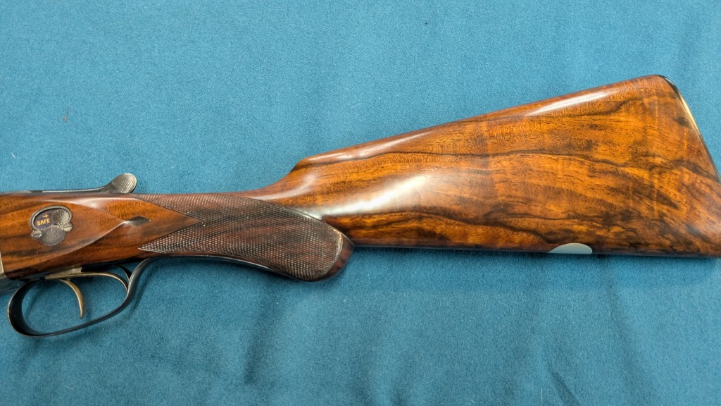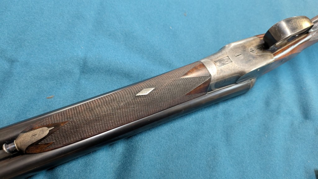 for 1904, 30in. nitro barrels with matt rib engraved 'W.W. GREENER. MAKER. 68, HAYMARKET. LONDON. WORKS ST. MARY'S SQUARE. BIRMINGHAM.' and with a brace of partridge at the breech end, 2 1/2in. chambers, bored approx. imp. cyl. and 3/4 choke, treble-grip action with side bolsters, manual side safety with gold-inlaid 'SAFE' detail, William Baker patent fore-end ejector mechanism, patent no. 17292 of 1896, use no. 786, border and acanthus scroll engraving, retaining much renewed colour-hardening and finish, 14 3/4in. figured replacement stock with horn-inlaid drop points, weight 6lb. 15oz., in a canvas and leather case