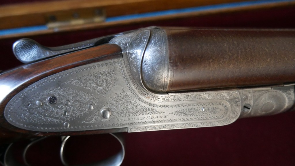 for 1877, 28in. nitro reproved bold damascus barrels (in 2024), the rib engraved 'STEPHEN GRANT 67A ST. JAMES'S STREET. LONDON.' and '1', 2 3/4in. chambers, bored approx. true cyl. in both, fluted leaf fences, removable striker discs, automatic safety with gold-inlaid 'SAFE' detail, triggers swept for the left hand, fine acanthus scroll engraving, retaining very slight traces of colour-hardening and finish, 14 1/4in. figured stock (slightly cast on for the left shoulder) including 1/2in. wooden extension, weight 6lb. 4oz., in a brass-cornered oak and leather guncase with reproduction trade label